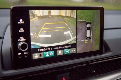 Indexelésre megjelenik a tükrökbe épített kamerák képe, besoroláskor hasznosak a berajzolt segédvonalak. A Hyundai megoldása annyiban okosabb, hogy a sofőr előtti kijelzőn jelenik meg, nem pedig a középső kijelzőn