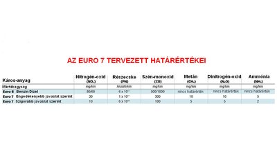Az Euro 7 korábban tervezett határértékei. A benzin- és dízelmotoros autók határértékei között nem lenne különbség