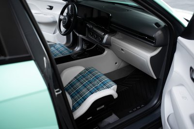 Thule Pulse Alpine a tetőn, az ülések pedig Recaro Sportster CS-ek. A Hyundai bedobta a Scosche PowerUp 32K hordozható töltőt az InVert 200 DC-to-AC adapterrel, hogy minden kütyü bírja villannyal az autós kalandokat.