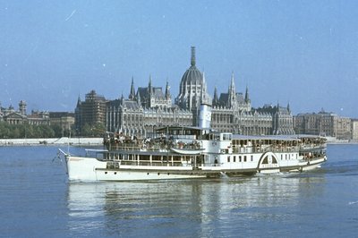 Kossuth lapátkerekes gőzhajó a Parlamenttel a háttérben. Az eredeti neve Ferencz Ferdinánd volt