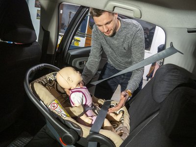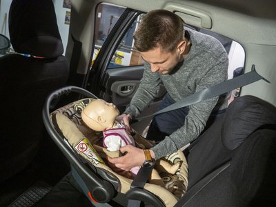 Hajduk Zoltán mentőtechnikus itt éppen egy babahordozóba köti be a gyermeket