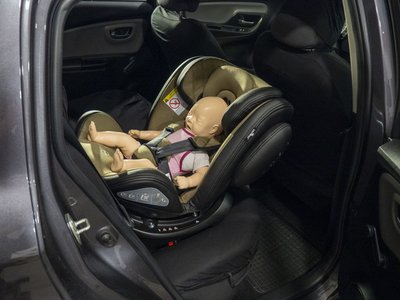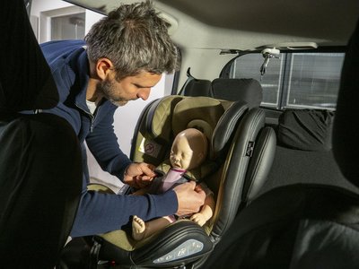 Itt már egy együtt növő gyerekülésben ül a baba, de még mindig menetiránynak háttal - kétéves korig ez az ajánlott