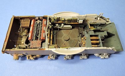 Jól mutatja a modell a T-55 belső elrendezését. A V12-es dízelmotor hátul keresztben, mögötte az erőátvitel. Elöl a lőszertároló, az előtt pedig az üzemanyagtank
