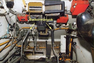 A T-55 vezetőállása. Két botkormány, a három autókból is ismert pedál és jobbra a sebességváltókar