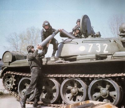 A T-55 lőszerrel feltöltése annak idején itthon. A homokkal töltött gyakorló lőszer súlya 45 kiló körül volt. A tárazás szintidőre ment