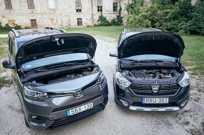 A Proace gyomra akkora, látszatra a Lodgy egészben beférne. Kialakítottak helyet a rolónak a padlón, a Daciájé otthon figyel egy szekrényben, használni viszont mindkettőt egyformán macerás