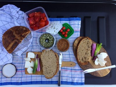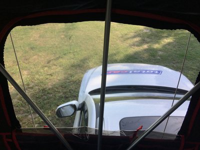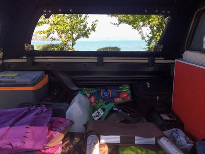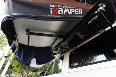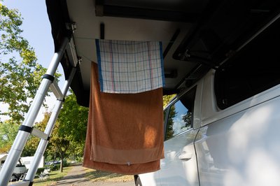 Lefordítva praktikusan ruhaszárítónak használtuk a tetőcsomagtartó keresztléceket. Mivel kevésnek bizonyult, némi zöld kötözőmadzag is rögzítésre került.