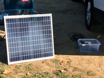Így még az erdő szélén táborozva se maradunk áram nélkül.A ládában a töltésvezérlő, pár fölös UPS akku és egy 300W-os inverter lakik. Bár kicsit kezdetleges, de működik, egy laptopot simán feltölt és ez ilyen nomád változatban pont elég is.