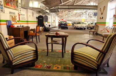 Harmincas évekbeli tetőszerkezet. Alatta sokkal fiatalabb veteránautók