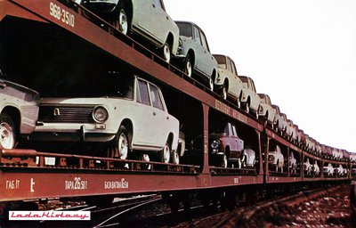 VAZ 2101-ek a speciálisan erre tervezett, két autó széles vagonokon. szállításra várva