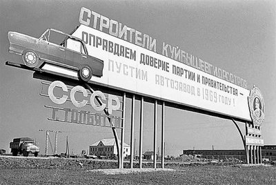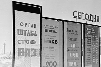 A Lenin-renddel kitüntetett Kujbisevi Vízépítő táblája fogadkozik, hogy a párt és a kormány bizalmát azzal hálálja meg, hogy 1969-re átadja a gyárat