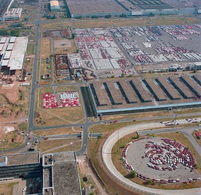 Elkészült autók ezrei, szállításra várva a gyárudvaron