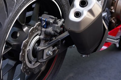 320 mm-es csipkés első tárcsa hátul 240-es tárcsa, elöl kettő, hátul egydugattyús nyereg