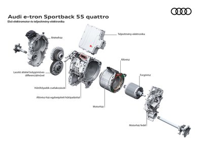 Oldalanként egy háromfázisú aszinkronmotor az Audi rendszerében, így nincs szükség differenciálműre