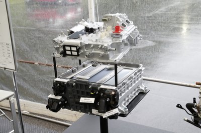 Felül a lítiumion akkumulátor, alatta a hátsó kerekeket hajtó elektromotor a vezérlő elektronikájával
