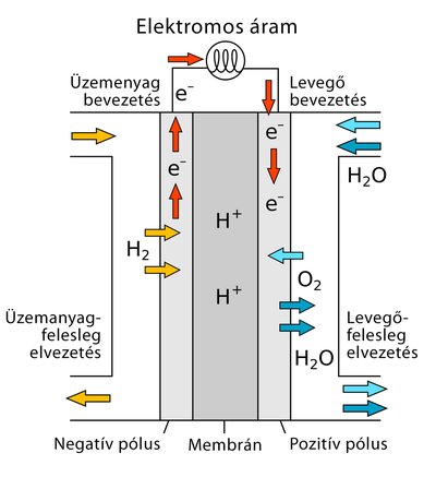Így épül fel és működik az üzemanyagcella. A legfontosabb rész a középső membrán, jobbról és balról mellette a katalizátorral bevont elektródákkal
