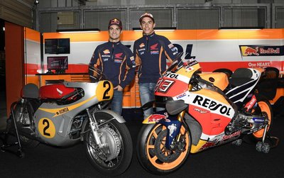 Zárásként pedig egymás mellett az RC181 és az RC213V. Előbbi mellett Dani Pedrosa, utóbbinál Marc Márquez