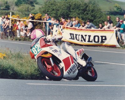 1985: Oxley a győztes futamon a 250-es gépével a Ballaugh Bridge-en ugrat