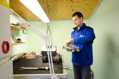 A teljes szervizszett egy emeletes gurulós bőröndben. Ezzel jár a versenyekre is.