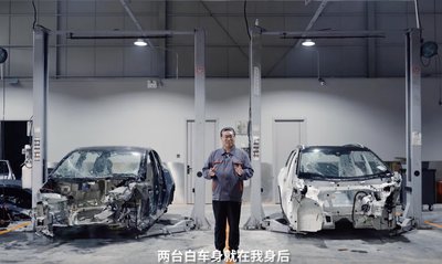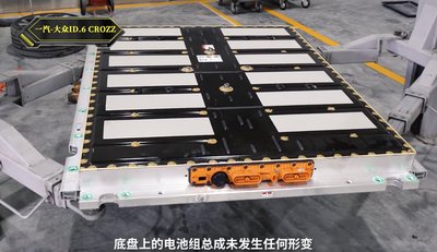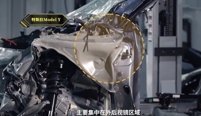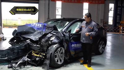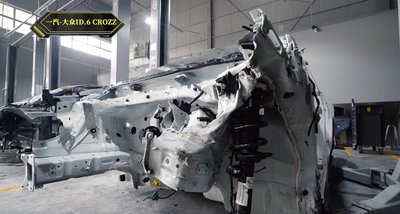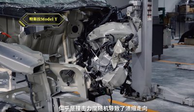Ez az európai gyártású Model Y egyetlen darabból présöntött első váza. Valószínűleg sokkal erősebb, mint a most összetört hagyományos építésű Y lemezei. A kisebb karamboloknál nem sérül, vannak lecsavarozható gyűrődőbakjai is, amik itt nem látszanak.