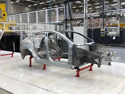 A grünheidei német Tesla-gyár Model Y-jának forradalmi első présöntvénye. Itt látszik a cserélhető ütközéselnyelő gyűrődőbak, hogy ne az egész öntvény sérüljön a kisebb ütközésekkor