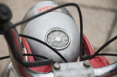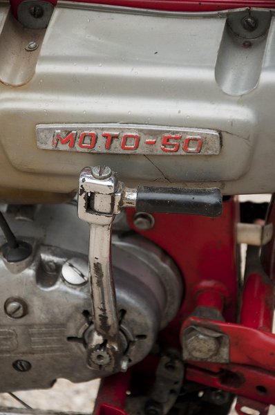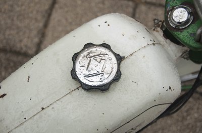 Pedál helyett berúgókar, lábbal működtethető hátsó fék - ezek a hetvenes évek végétől gyártott Rigák vívmányai. A képen egy hibrid példány, 16-os alapra épül, de 22-es blokk van benne. Túramotor, ahogy a klubosok mondják