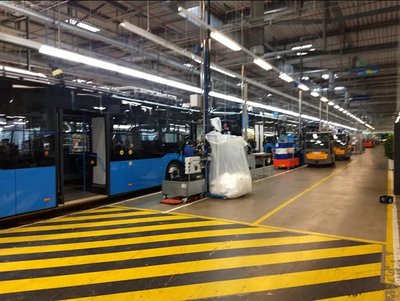 A korszerű mannheimi Mercedes gyártósor tele bilikék elektromos buszokkal (fotó: Omnibusz Facebook oldala)