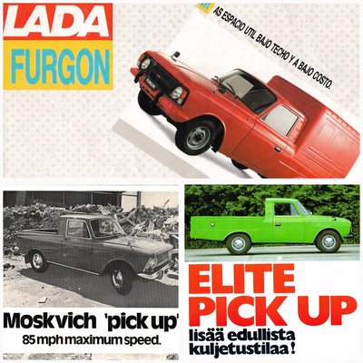 Felül egy 1988-as chilei, bal oldalon alul egy angol hirdetés, a jobboldali egy hosszabb változat egy finn prospektusban