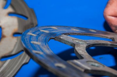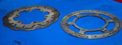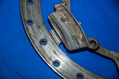 A hátsó tárcsa azon kívül, hogy a kopáshatár alatt van, az erősen elkopott betét úgy lekoptatta a tárcsa belsejét, hogy az kis híján levált az agyrészről