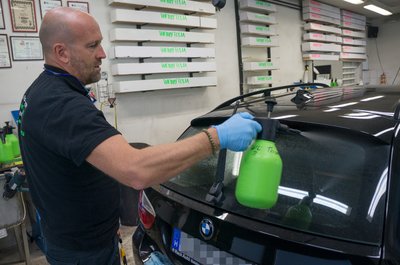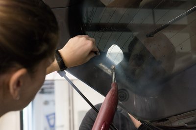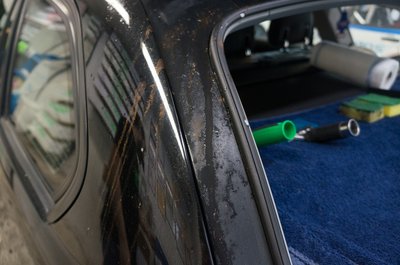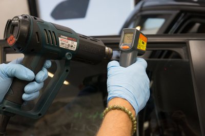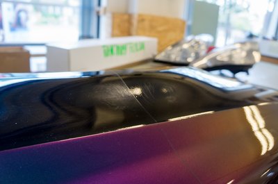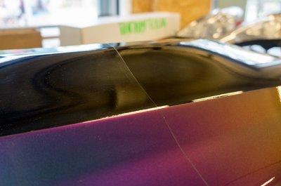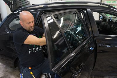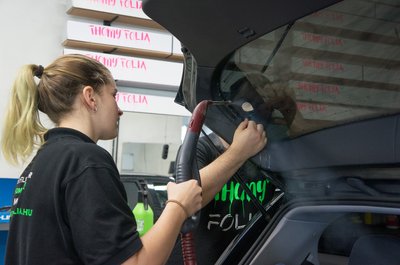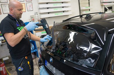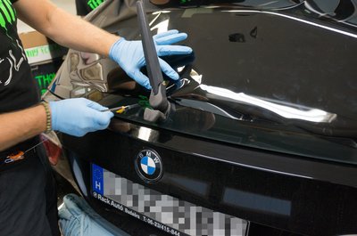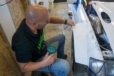 A fólia leszedését is melegítéssel végzik, máskülönben csak apró darabokban jönne le. Így is eltarthat akár két napig is a felületelőkészítés, mert arra is figyelni kell, hogy a speciális karosszériaelemeket ne süssék meg