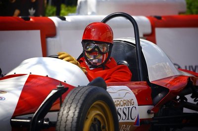 A Classicon nem csak ilyen őskövületek, mint ez az 1957-es Formula V versenyautó, hanem a hozzá illő, korhű viselet is kötelező elem. Reggeli beindításakor olyan hangja volt, hogy még a Bazilika tetején lustán pöffeszkedő galambok is dupla adag guanót nyo