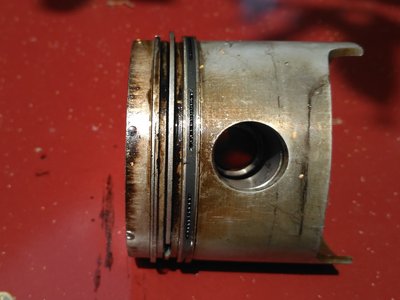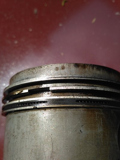 Csak összehasonlításnak itt egy 40 évvel korábbi dugattyú. A gyűrűk vastagsága, kiképzése teljesen más. Nyilván a súrlódása is nagyobb. De nézzük meg, nincs lefújás vagy nagy kormozódás, hiába futott vagy 300 ezer km-t