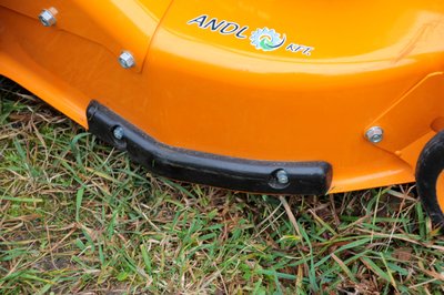 Egy profi fűnyírót az ilyesmikről lehet felismerni: a kiálló részeket felcsavarozott koptatócsík védi