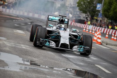 Valtteri Bottas megtalálta a Deák tér egyetlen pocsolyáját. A térelválasztó elemek folyamatosan engedték magukból a vizet, így néhány helyen erre is fel kellett készülniük a pilótáknak