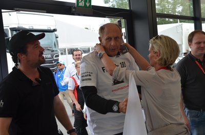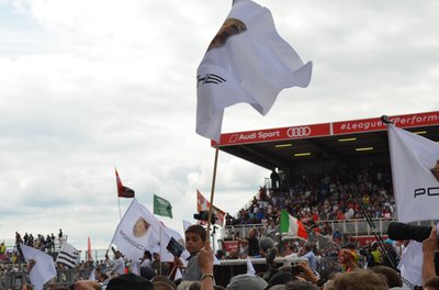 Porsche-zászlók mindenhol, tengernyi ember a pódium előtt