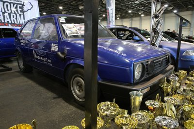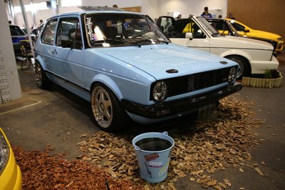 A sárvédőn keresztülvezetett kipufogó és az a furcsa hátsó kerék... Bizony, ez egy hátsokerekes Golf dragster