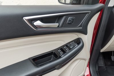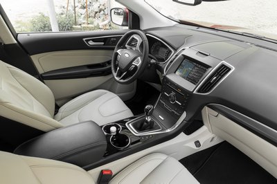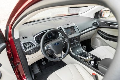 Fekete és vajszínű bőrkárpittal láttuk az európai Edge-t. Utóbbi a hangulatosabb, előbbibe ültetnénk szívesebben gyerekeket