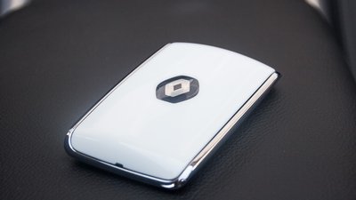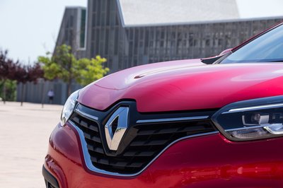 A jeti-tenyérnyi méretű Renault embléma és a márkajelleg hűtőmaszk uralkodik a kocsi orrán