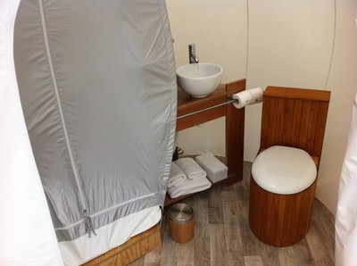 Zuhanykabin sátoranyagból, mosdó és a pottyantós, faforgáccsal ártalmatlanítós budi: Kemping körülménynek ez már nem mondható, táborban ez már a luxus szint