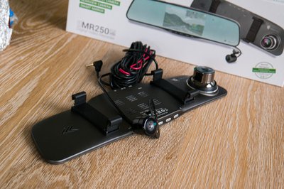 Navitel MR250: a tükörkamera és a hozzá tartozó tolatókamera, amit vezetékkel kell a központi egységhez kapcsolni