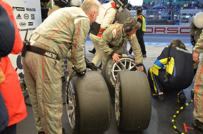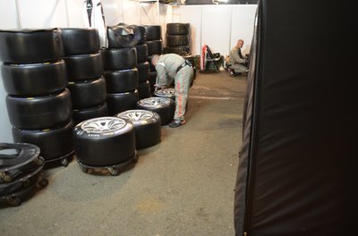 A melegedő sátorban a következő körre való abroncsok. Már mesze a kiállások előtt várják a bevetést. A hosszú melegítés fontos, hogy mélyen a futófelület alatt átmelegedjen a gumi