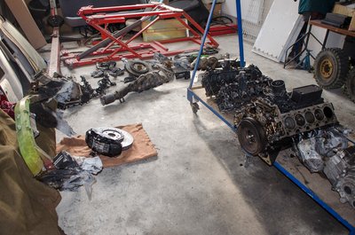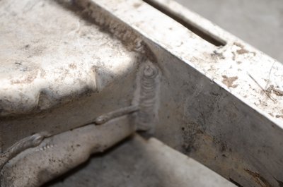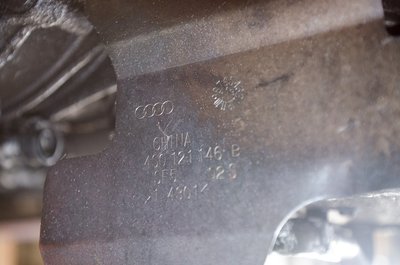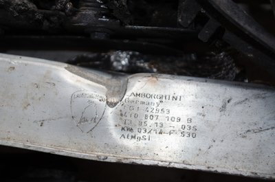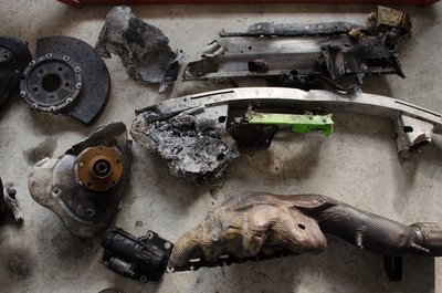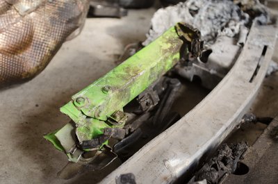 A kevés fényezett túlélő egyike: a hátsó merevítőgerenda, rajta lóg a lengőkar torzója
