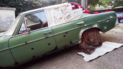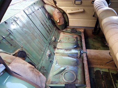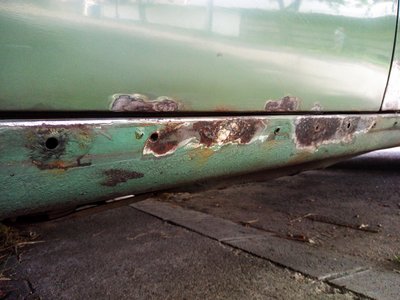 Azt tudtam, hogy a küszöbdíszléc alatt bajok lesznek, de maga a küszöb vastag, nehezen rozsdásodik át, belülről meg védi a Mike Sanders üregzsír. Ez még a gyári elem, sose volt cserélve 43 év alatt. Mutassanak még egyet