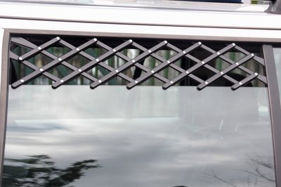 Az lehúzott oldalablakba feszíthető rácson keresztül jól szellőzik a kocsi, de a kutya nem tud kilógni, és senki nem tud benyúlni a kocsiba
