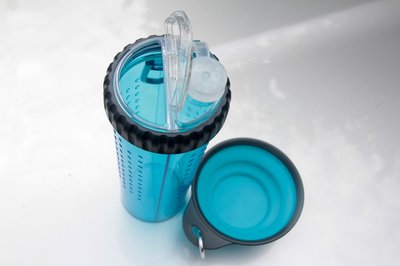 Több mint kulacs: az egyik rekeszbe víz, a másikba száraz táp tölthető, a kipattintható tálkából etetni-itatni lehet