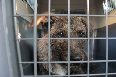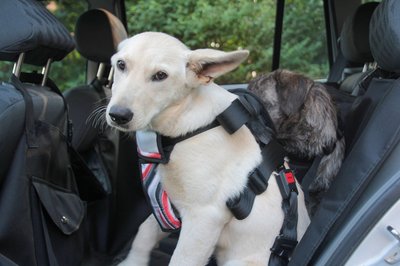 Jancsi és Mici kutyák még kicsik, ezzel együtt egyáltalán nem élték meg vegzálásnak sem a hámba kötést, sem a dobozba bemászást - igaz, nem is kellett órákat így lenniük