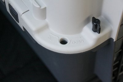 A kemény szállítódoboz sarkainál található furatokba rögzítő kampókat lehet csavarozni, de ilyet sajnos nem adnak a készletben, külön kell beszerezni. Ha ezeknél fogva leszíjazzuk a kocsiban, még a doboz sem fog tudni elmozdulni
