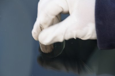 ......majd, mikor teljesen megkötött, eltávolítják a műanyag lapot. Egy éles pengével, gyors mozdulatokkal minden felesleget eltávolítanak. Most már a javítás egy síkban van az üveg felületével