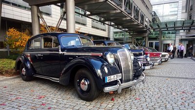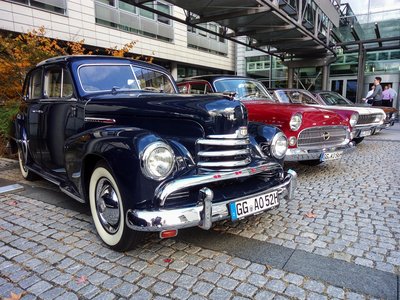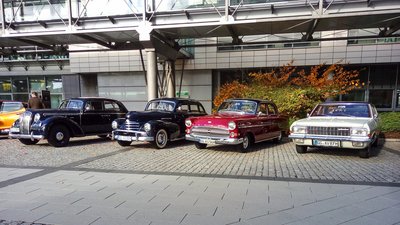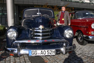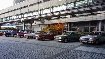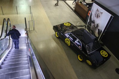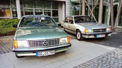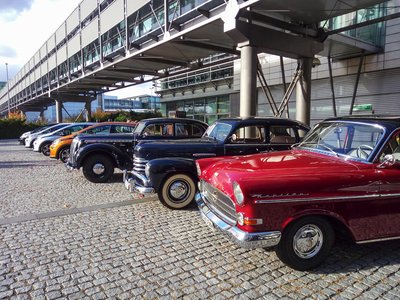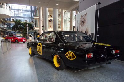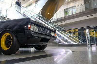 Rekord C versenyautó szemléli komoran a rüsselsheimi központ modernségét