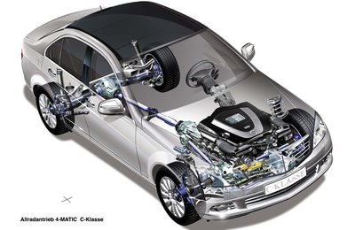 A Mercedes alatt is állandó összkerékhajtás dolgozik, részlegesen önzáró középső differenciálművel, ami 50 newtonméterig működik. A kerekek közti nyomatékelosztást az elektronika segíti, vagyis az elpörgő kereket megfékezi, így a nyomaték átkerül a még ta